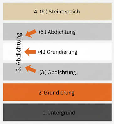 Aufbau: Untergrundvorbereitung, Grundierung, 1K-Abdichtung, Bindemittel, Marmorsteinteppich, optional Versiegelung